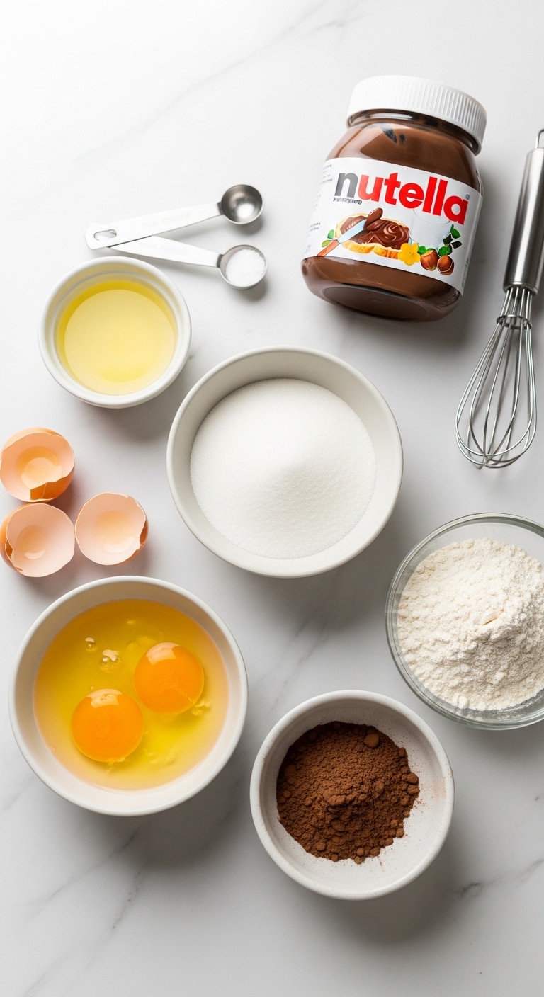 • 200 g Nutella, 100 g sugar, 2 large eggs, 60 g flour, 30 g cocoa powder, pinch of salt