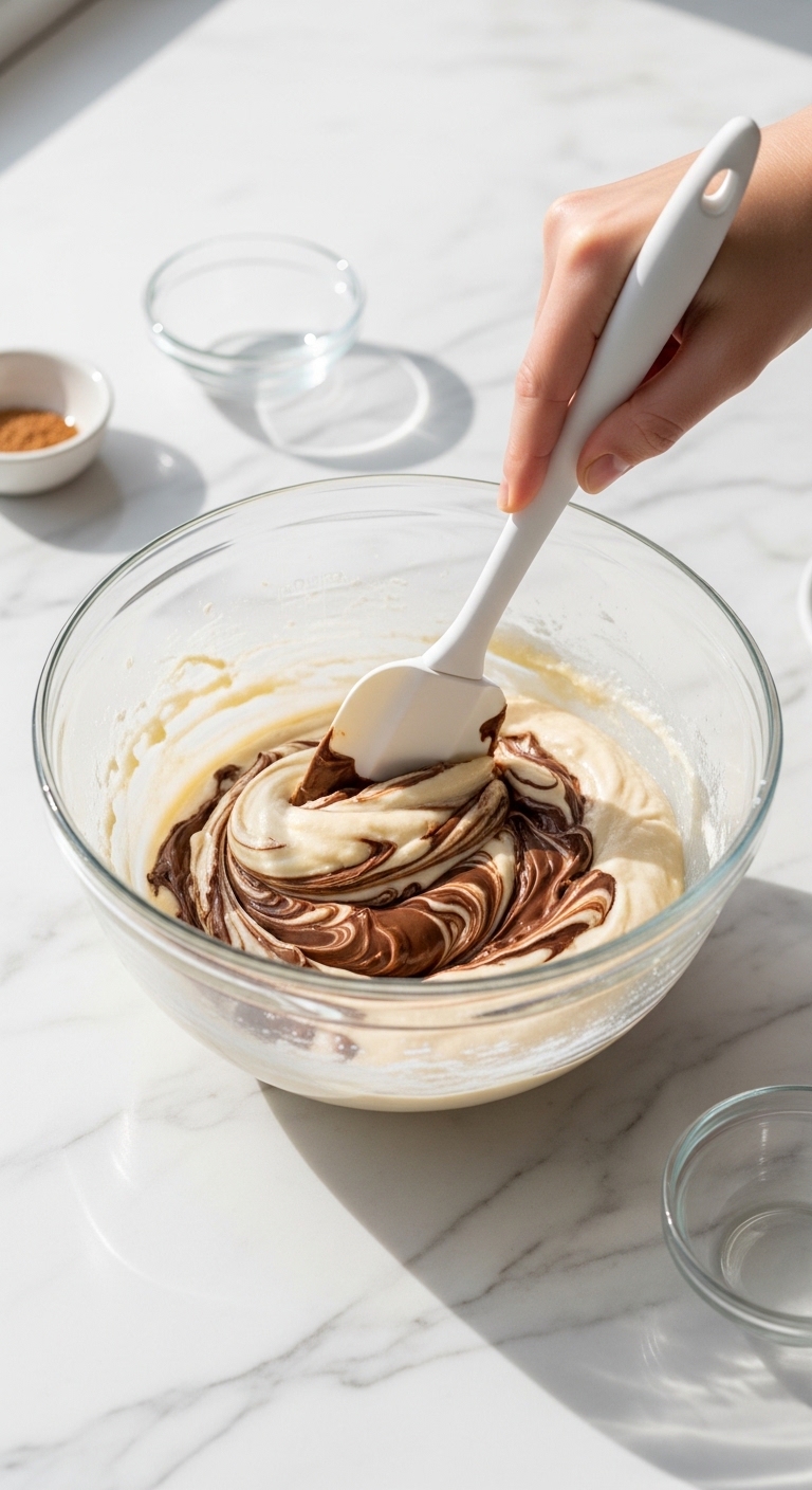 You want glossy, smooth batter—don’t overmix. If you have a stand mixer, use a low speed; otherwise a bowl and spatula work fine.