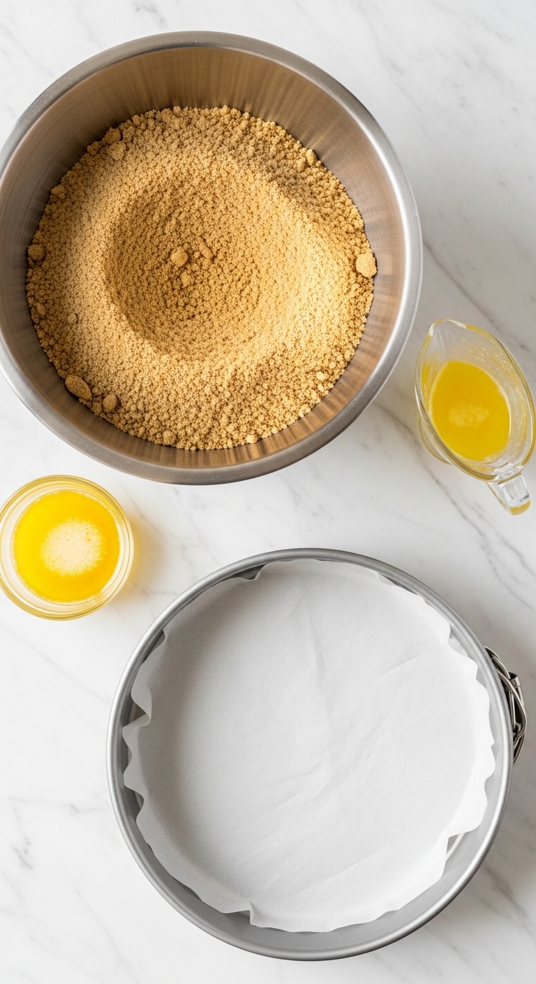 Use a springform pan so the cheesecake lifts cleanly. Lining with parchment paper helps when you release the ring.