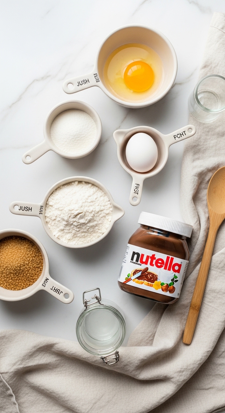 Start with room-temperature ingredients and weigh when possible. For a small batch use 1 cup (280 g) Nutella, 1/2 cup (115 g) unsalted butter, softened, 3/4 cup (150 g) brown sugar, 1 large egg, 1 1/4 cups (155 g) all-purpose flour, 1/3 cup cocoa powder, 1 tsp baking powder, and 1/2 tsp salt.