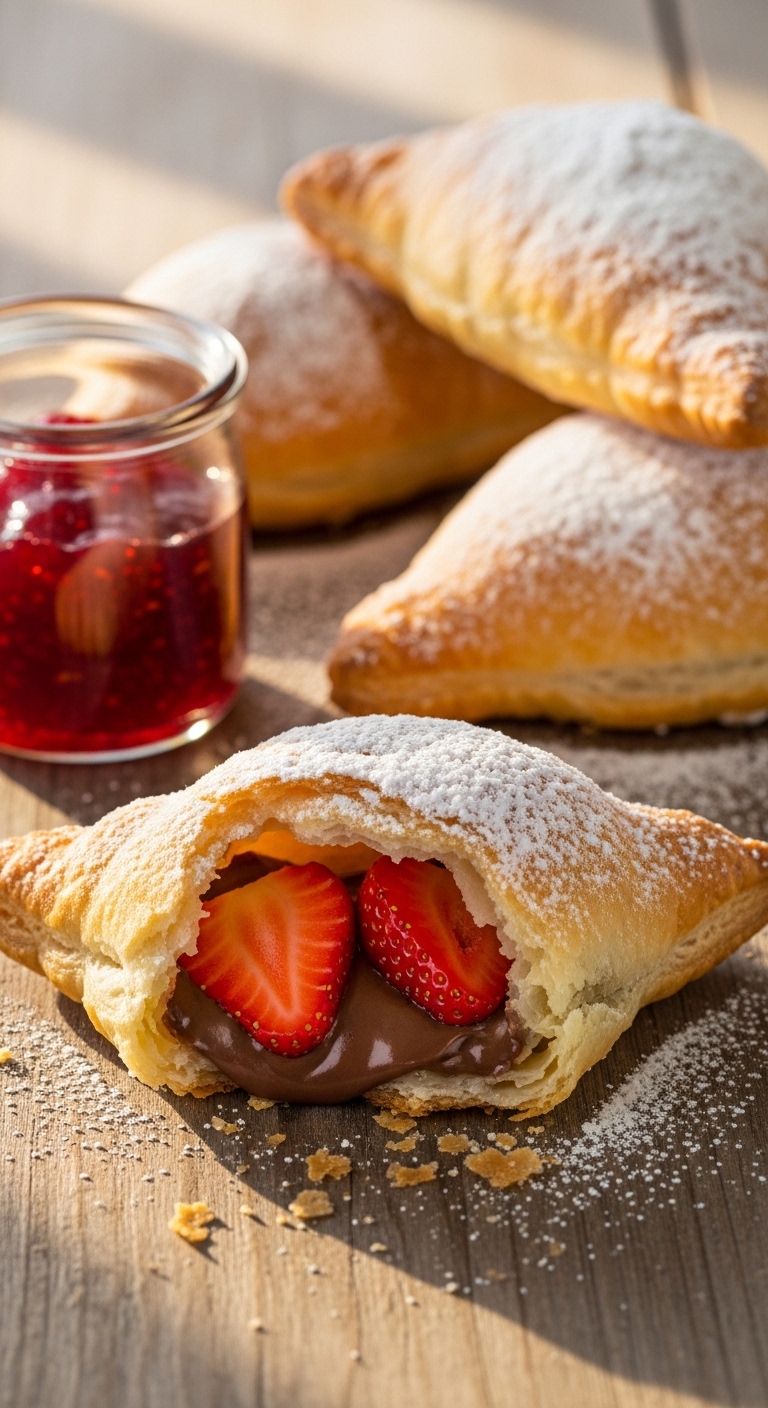 Flaky puff pastry stuffed with Nutella and strawberries makes a bakery-style treat at home—easy to assemble and bake. Kids love the flaky layers and sweet filling.